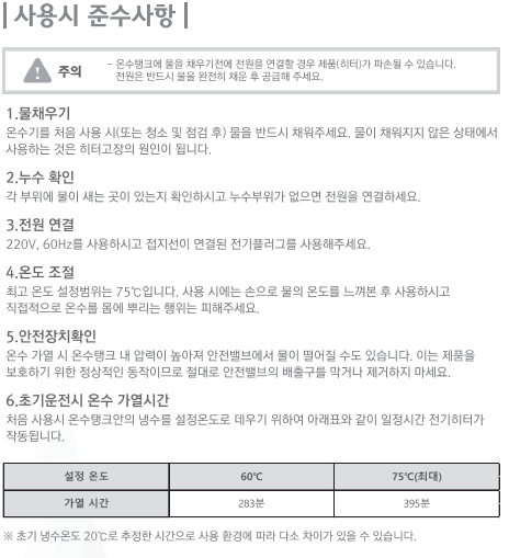 ※급수물을 꼭 보충 후 전원을 연결하여야 합니다. 전원을 먼저 공급시 히터봉 불량이 생겨 온수공급에 문제가 발생합니다.